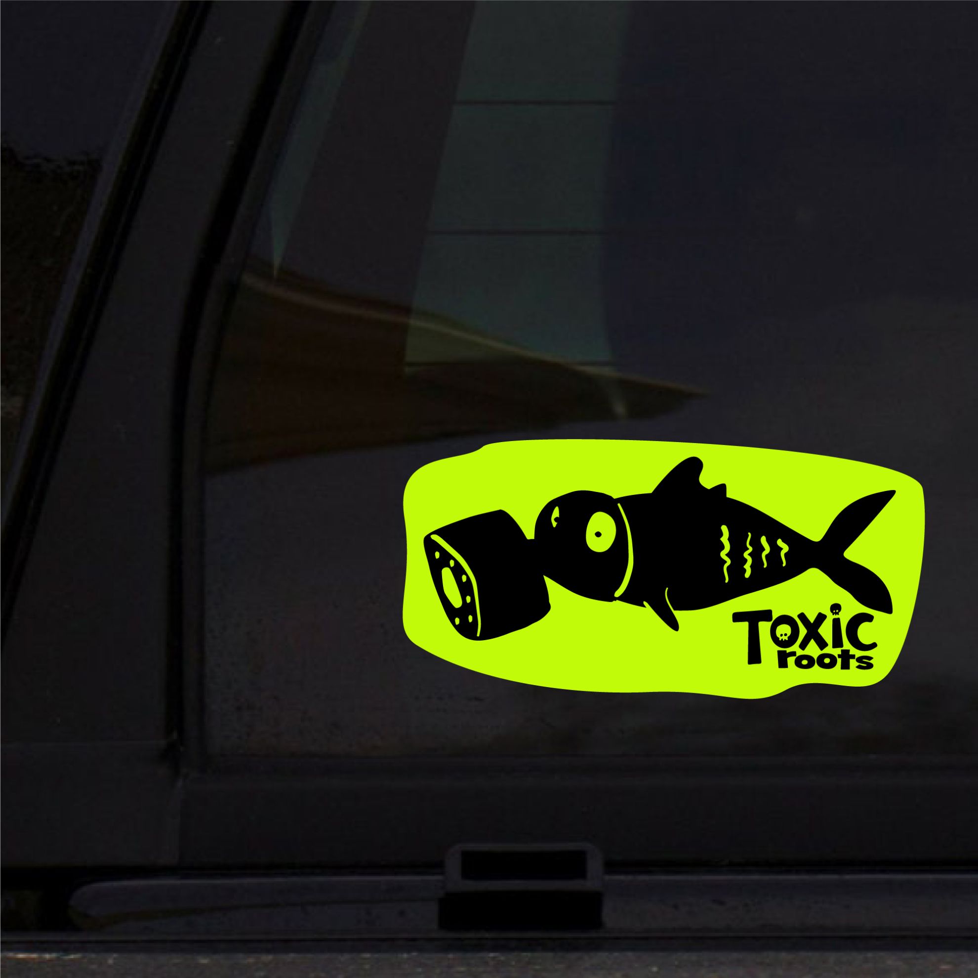 The Gas Mask Fish Sticker is 3 1/2 inches x 1 3/4 inches.